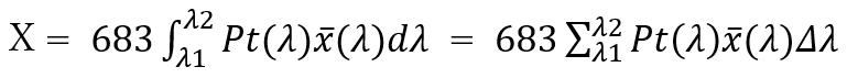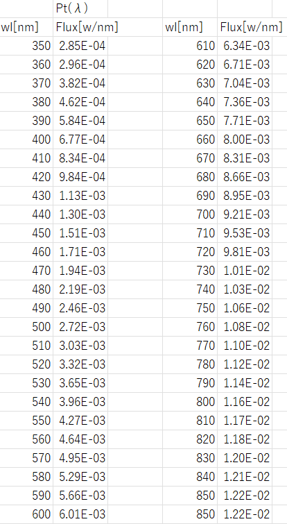 ある値Xを各波長に掛け算すれば放射束[W]が求まるという仮定で、以下の計算を行います。