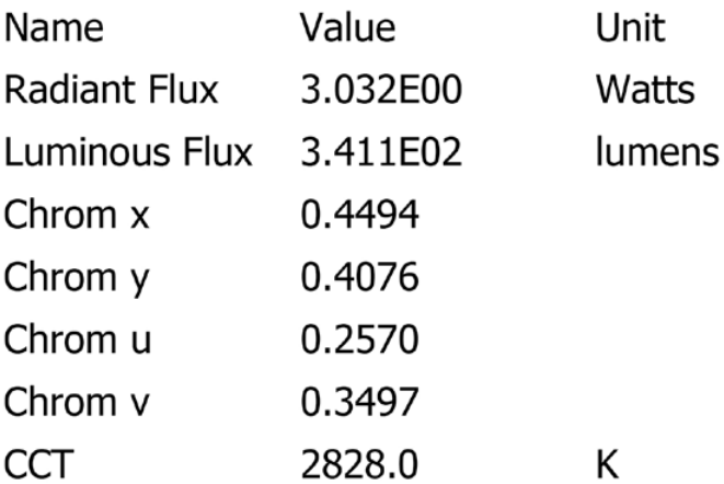 のRadiant Flux(放射束)、Luminous Flux(光束)、 xy色度、 uv色度、
