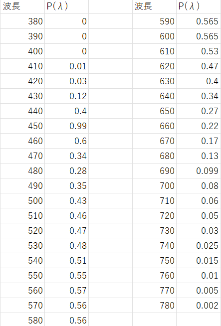 P(λ)は図-5.1から読み取った相対分光分布で以下の表(図-5.3)になります。