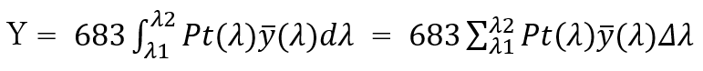 はV(λ)に一致していますので、式(5.5)の全光束と式(5.7)の三刺激値Yは等し
