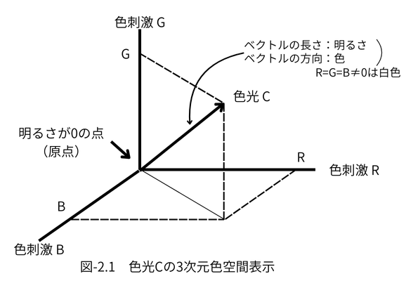 R、G、Bを3次元軸にとり、色光Cをベクトルで表現すると以下の図-2.1の