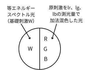 原刺激の明るさを調整して加法混色し、等エネルギースペクトルの白色と等色させ