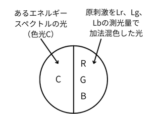 また、色光Cに原刺激の明るさを調整して加法混色して等色させた場合の原刺激の