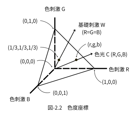 色光Cの色合いは単位平面を横切る座標(r, g, b)で表色されます。