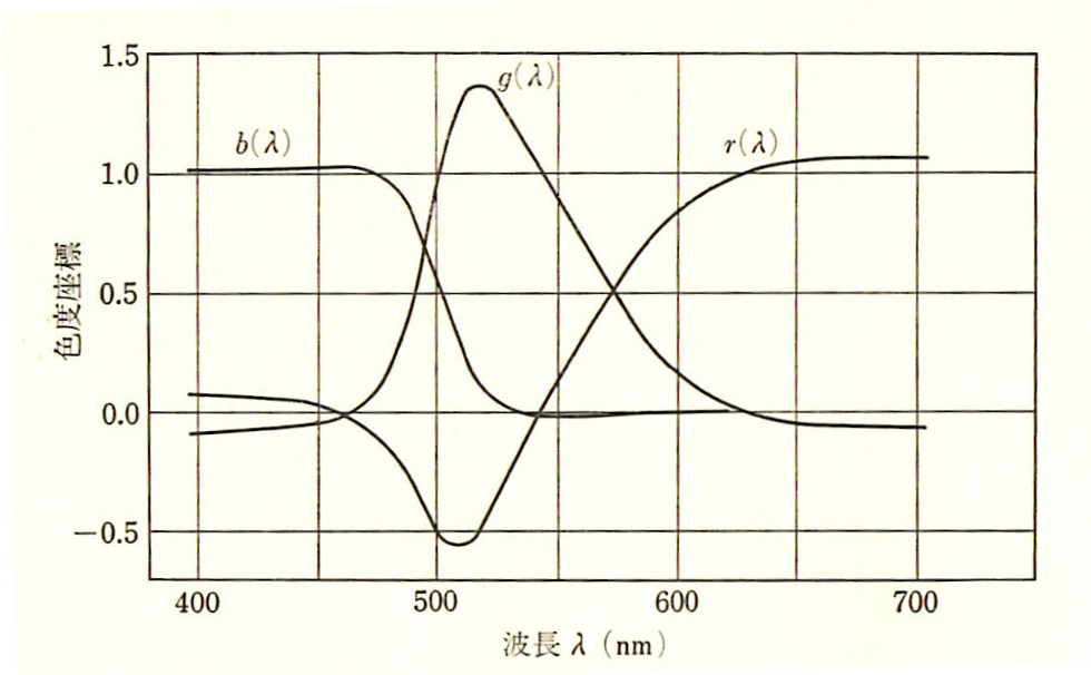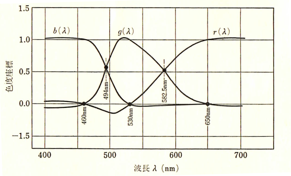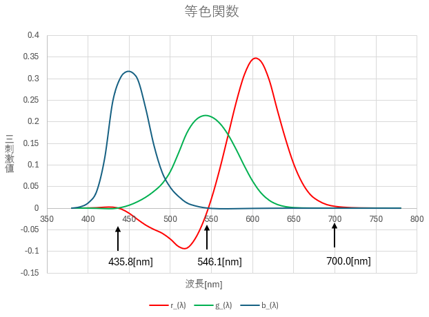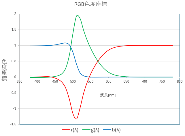 色度座標r(λ)、g(λ)、b(λ)はライトとギルドのデータを平均したデータが採用されました。