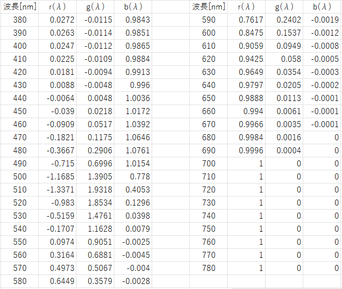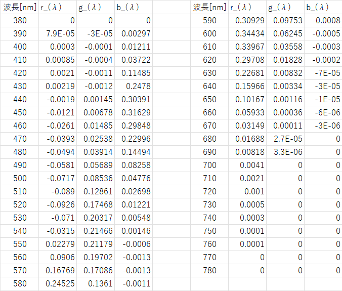 CIEが定めた色度座標 r(λ)、g(λ)、b(λ)のデータとグラフを以下に示します。