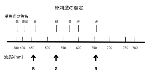 原刺激は、700[nm]、546.1[nm]、435.8[nm]の3つの単色光に決められました。
