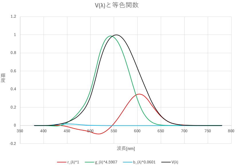 明度係数を掛けることにより輝度が得られ、これが分光視感効率となります。