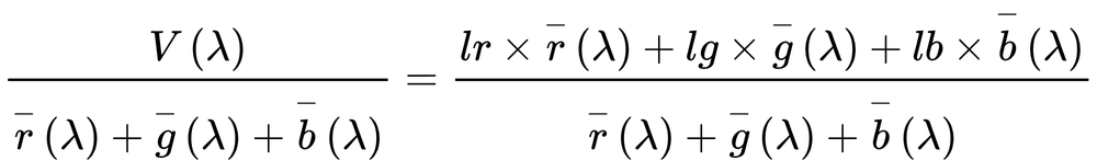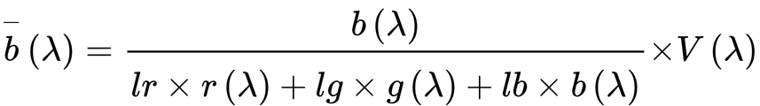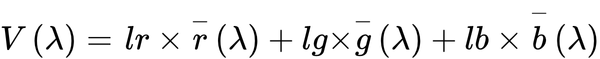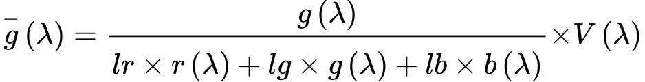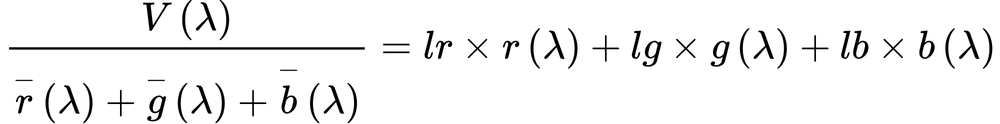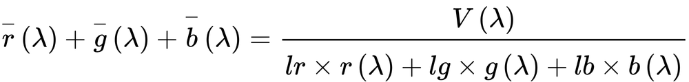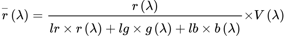基礎刺激は等エネルギーの白色で、原刺激R、G、Bの明度係数lr、lg、lbは測光量の単位で