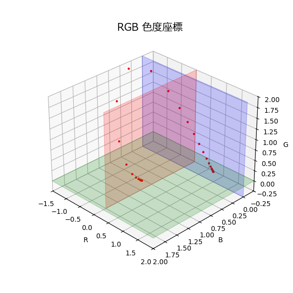 上記RGB色度座標を3次元表示すると図-2.10のようになります。