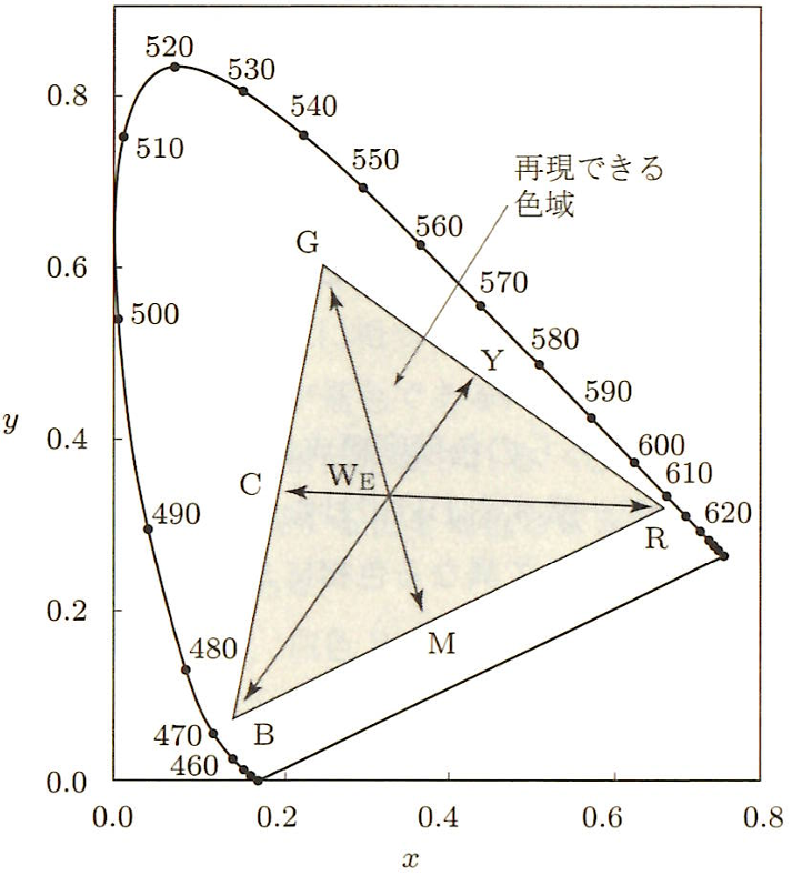 三原色を用いて加法混色する色再現デバイスの表現可能な色域は、原色の色度座標を頂点とする